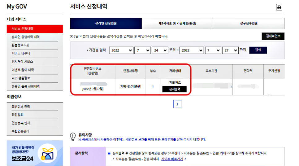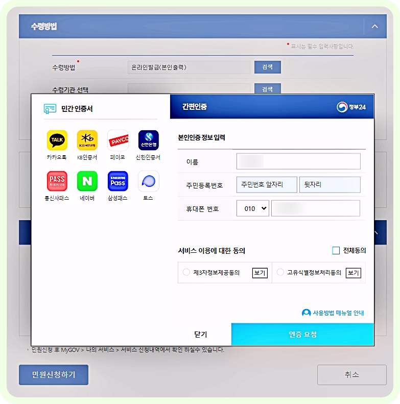 간편인증(민간인증서 등)을 거친 후 '서비스 신청내역'에서