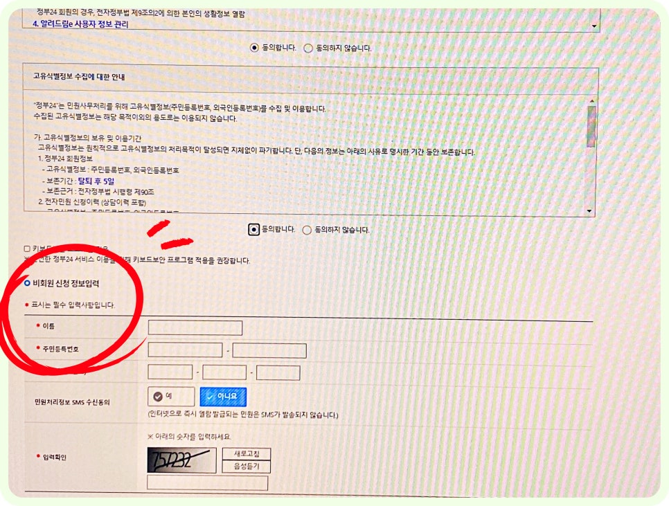 비회원 신청이 가능합니다. 이름, 주민등록번호 등 기본 정보를 입력하고 동의 절차를 거칩니다.