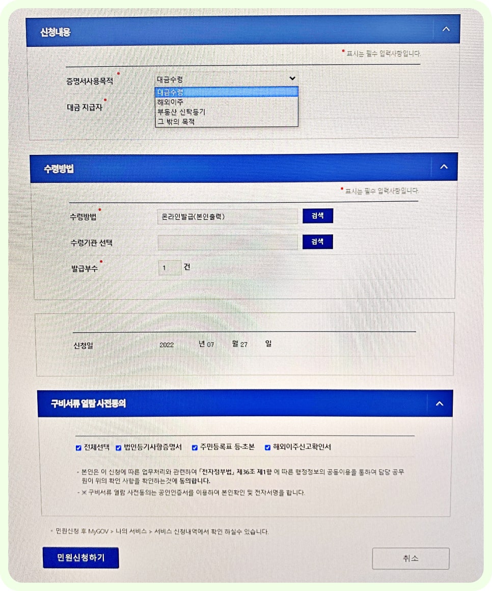 증명서 사용 목적을 선택해야 하는데, 보통은 '금융기관 제출용'으로 기입하는 것이 편리합니다. -