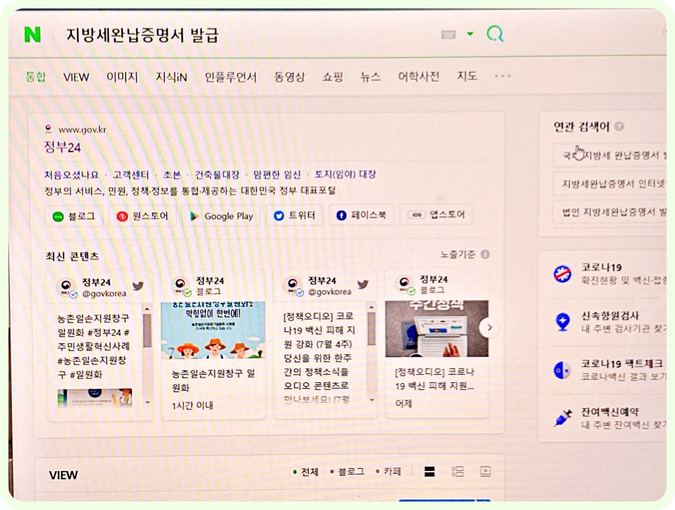 검색창에 '지방세 완납증명서'를 검색하여 정부24 공식 홈페이지에 접속합니다. -