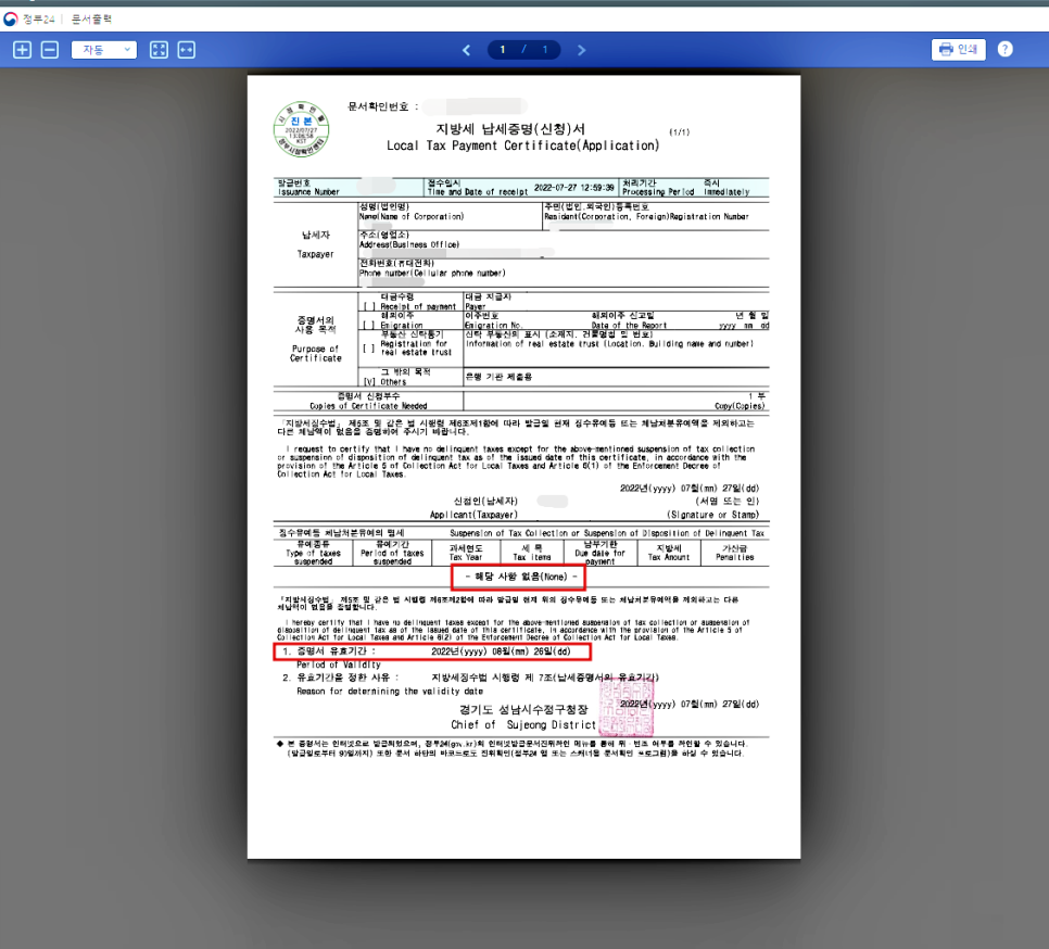 문서 하단 빨간 네모 칸에 '해당 사항 없음'이라고 적혀 있어야 체납액이 없다는 뜻입니다. (미납 시 세목과 가산금이 표시됨) - 유효 기간: 발급일로부터 1개월 동안만 유효하므로 필요할 때 바로 발급받으세요.