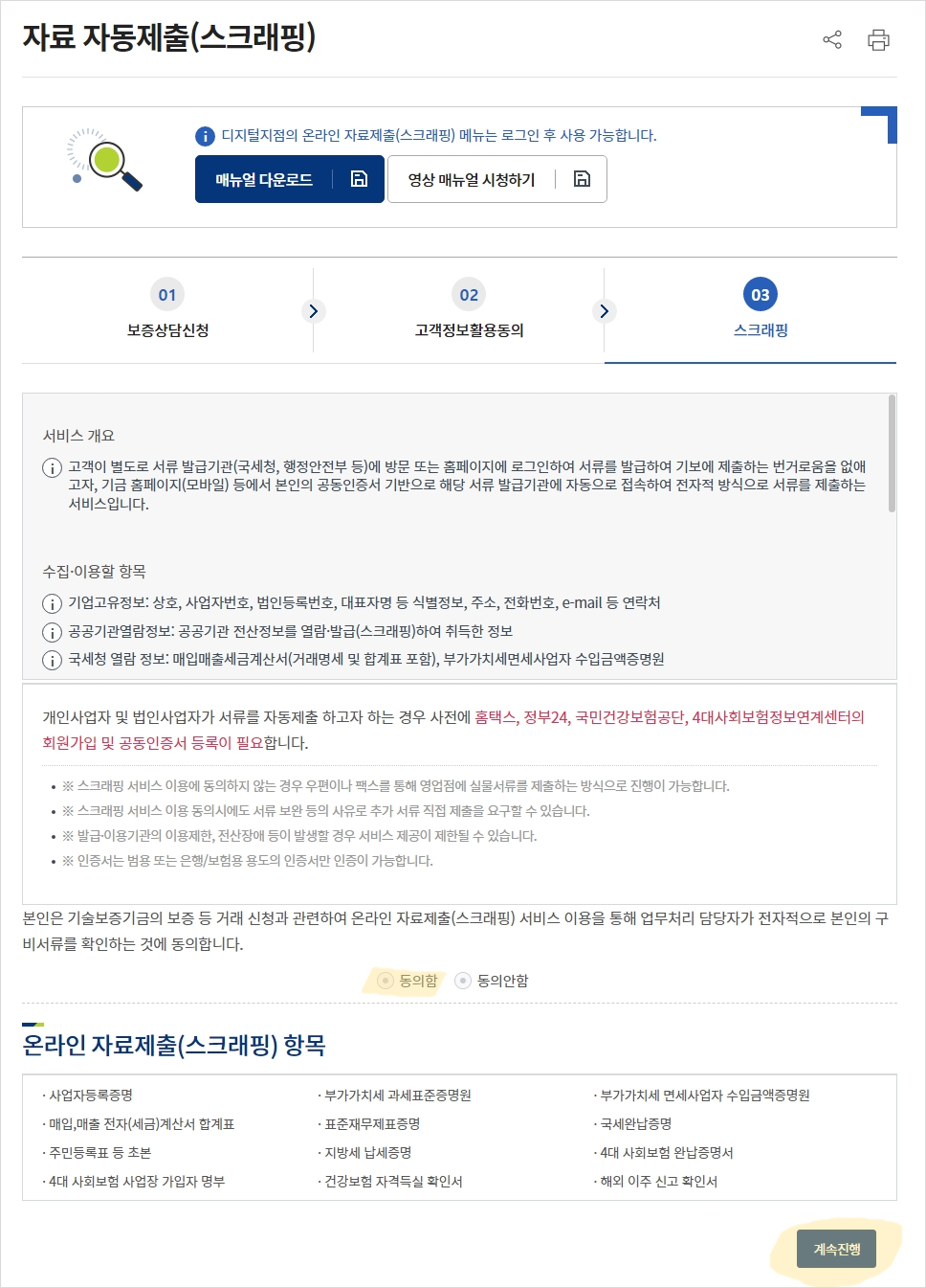 14)스크래핑(자료 자동 제출) 체크 후 계속진행