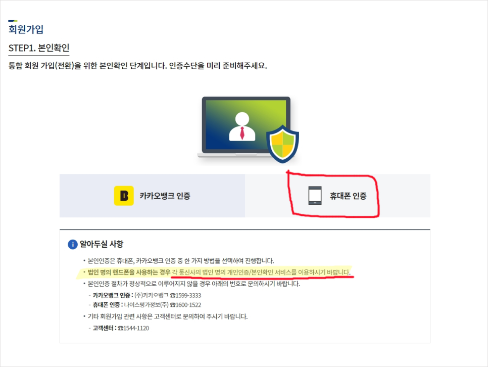 ※ 법인인데 인증이 안될경우, 해당 통신사 고객센터에 전화하셔서 "법인 핸드폰 대표자 본인인증 서비스 신청한다" 라고 하신 후 다시 이용해주세요. 약 1일 정도 소요 됩니다.